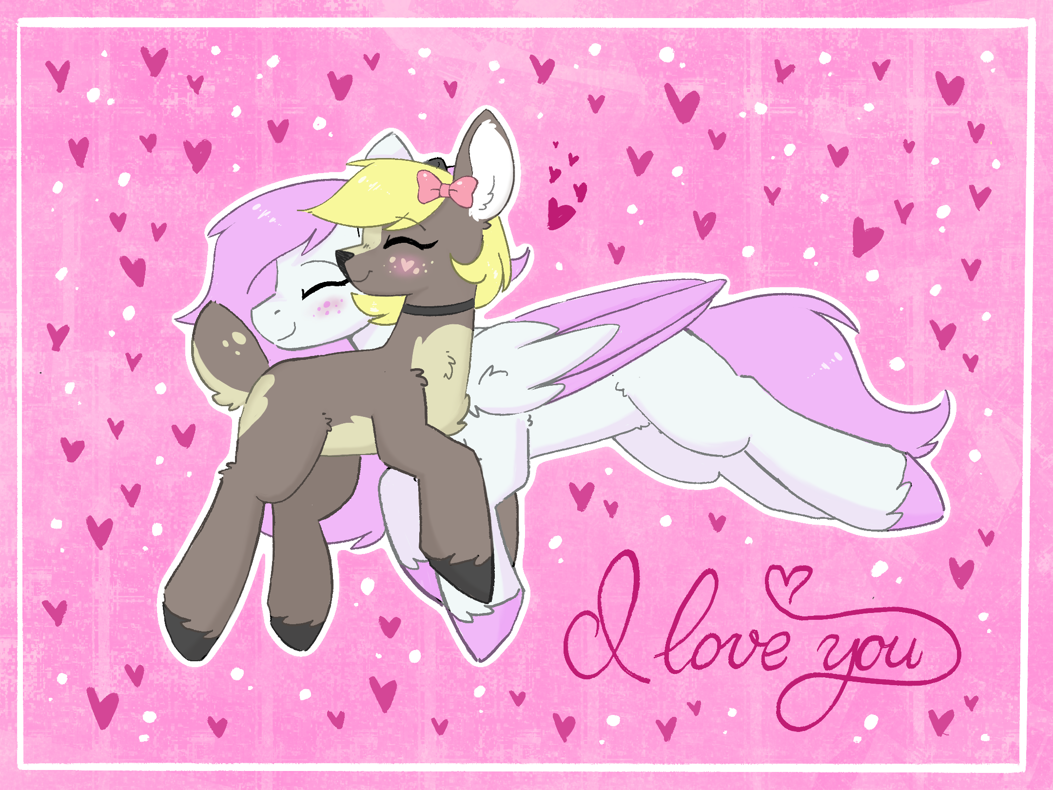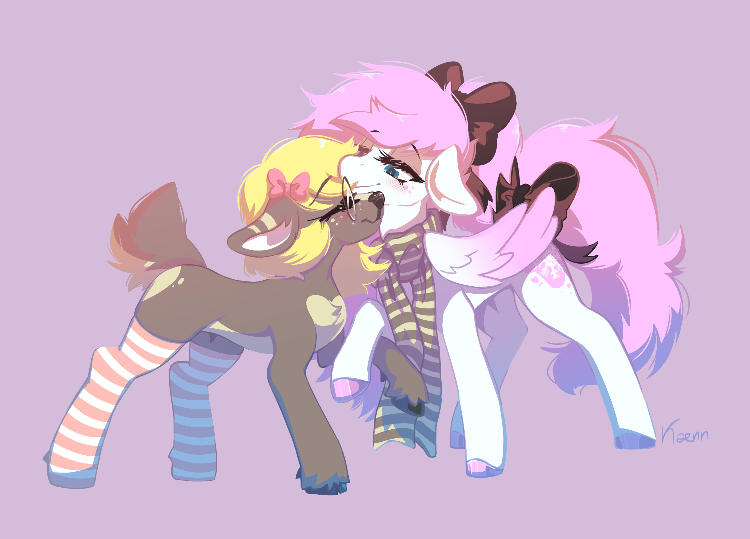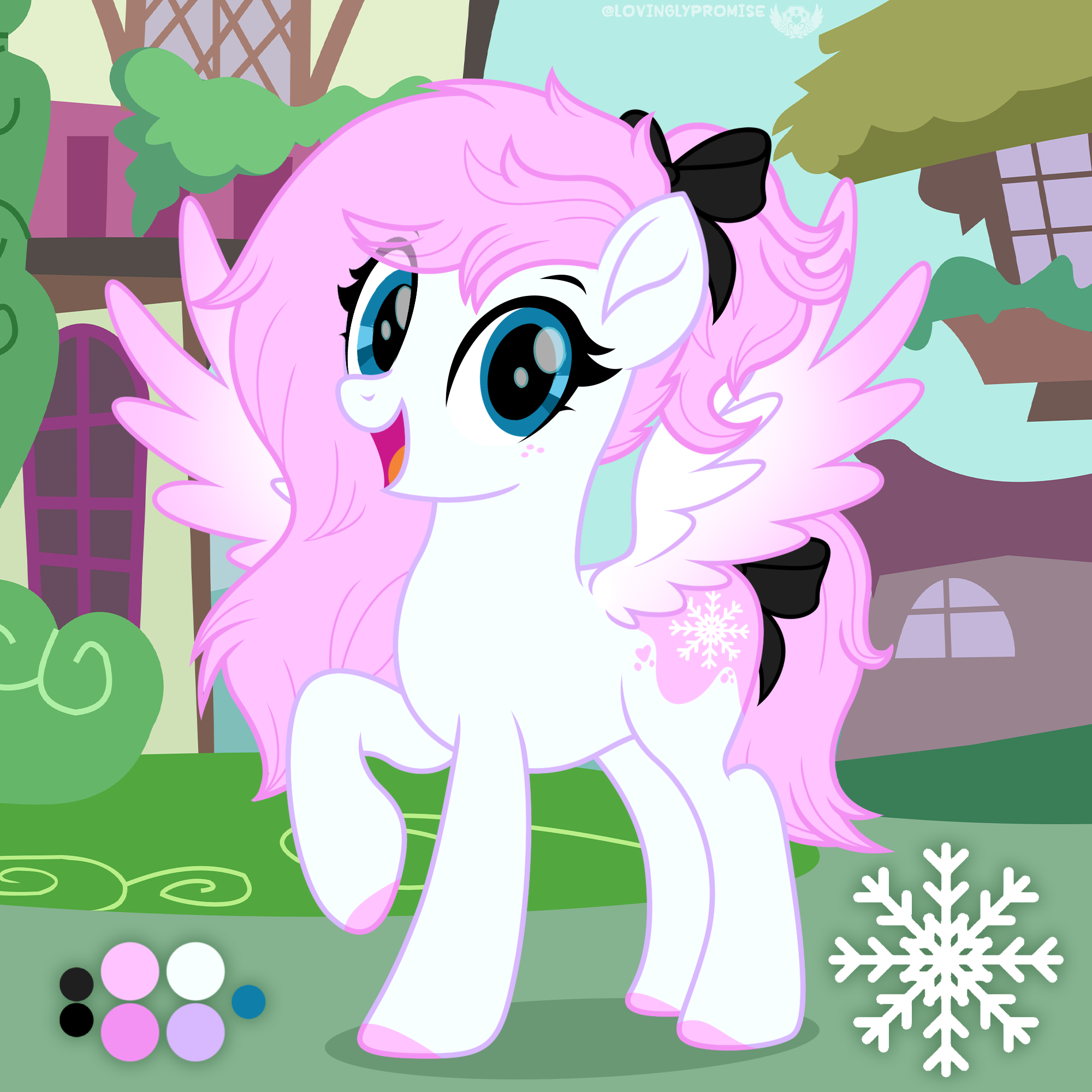 Frost Blush is a gentle winter pony with a heart as soft as snow and hair like cotton candy. She loves wandering through snowy forests with her loving girlfriend, bringing warmth and sparkle wherever she goes. Quiet and thoughtful, her soft pink mane and glowing white coat make her a truly magical presence.